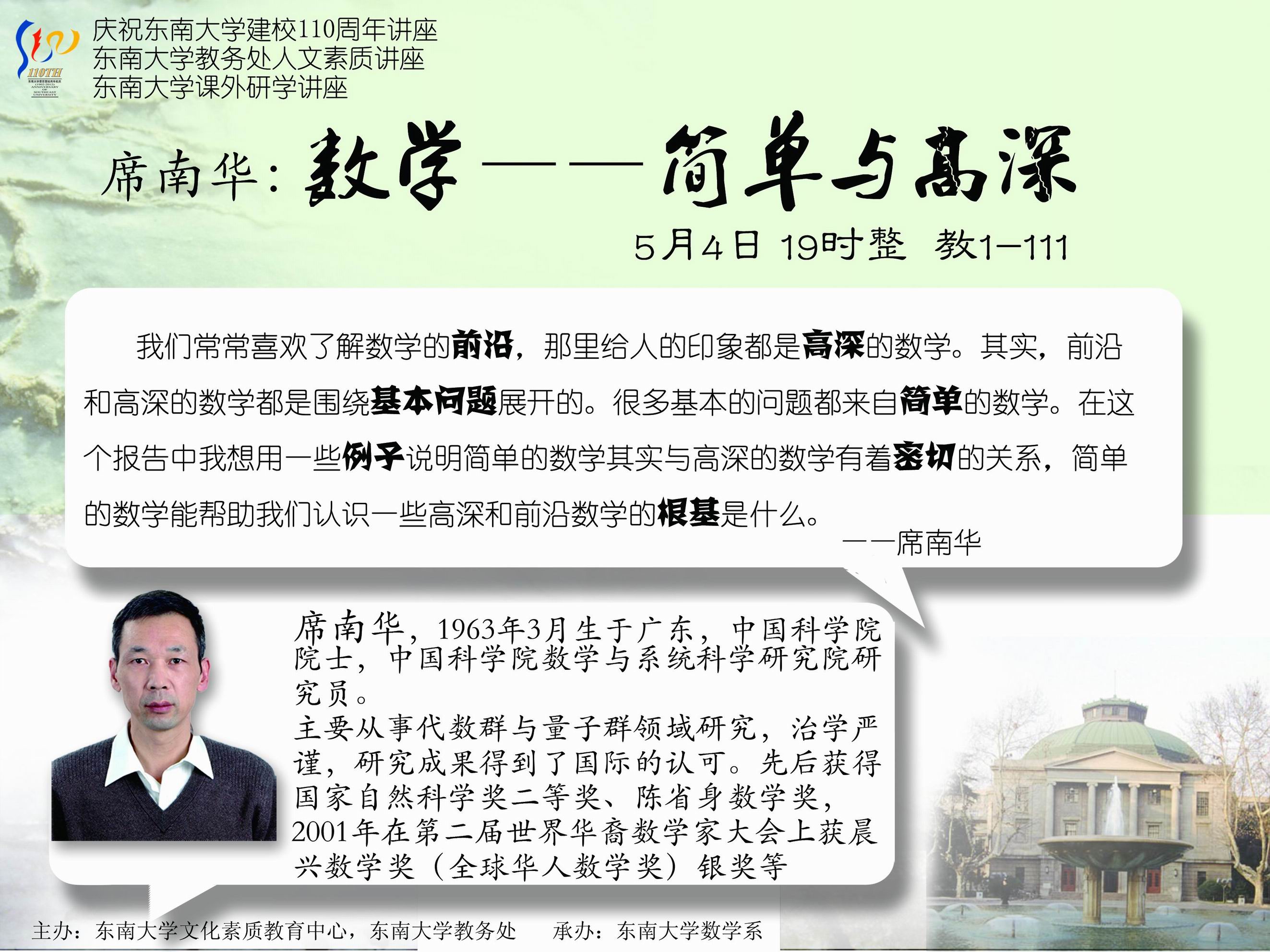 演讲人:席南华(中国科学院院士,数学家) 主 题:数学――简单与高深 时 间:5月4日(周五)晚19:00 地 点:九龙湖校区教一111 主 办:350vip8888新葡的京集团数学系 350vip8888新葡的京集团教务处 350vip8888新葡的京集团文化素质教育中心 承 办:共青团350vip8888新葡的京集团数学系委员会 备 注:该讲座已经列入“350vip8888新葡的京集团课外研学讲座”系列和“350vip8888新葡的京集团文化素质教育讲座”系列。 为庆祝350vip8888新葡的京集团建校110周年,350vip8888新葡的京集团数学系诚邀到了中国科学院院士,数学家席南华教授与东大学子分享关于数学的简单与高深。 我们常常喜欢了解数学的前沿,那里给人的印象都是高深的数学。其实,前沿和高深的数学都是围绕基本问题展开的。很多基本的问题都来自简单的数学。本次讲座中,席南华院士将用一些例子说明简单的数学其实与高深的数学有着密切的关系,简单的数学能帮助我们认识一些高深和前沿数学的根基是什么。机会十分难得,欢迎大家踊跃参加! 席南华院士简介 席南华,数学家,中国科学院院士,中国科学院数学与系统科学研究院研究员。1963年3月生于广东省英德,1981年毕业于湖南怀化师范专科学校(现怀化学院)数学科,1985年、1988年先后获华东师范大学数学系硕士、博士学位。 席南华主要研究代数群与量子群,对仿射A型Weyl群证明了Lusztig关于双边胞腔的基环的猜想,确定了Deligne-langlands关于仿射Hecke代数的猜想成立的充要条件,与Lusztig合作发现典范左胞腔,对量子群的基进行了系统的研究,这包括与Chari合作构造了量子群的单项基,计算了某些典范基,对根向量及其交换公式的研究等。 席南华曾获国家自然科学奖二等奖、陈省身数学奖等。1994年成为数学研究所研究员,同年获首届国家杰出青年基金. 2001年在第二届世界华裔数学家大会上获晨兴数学奖(全球华人数学奖)银奖。 席南华所从事的代数群与量子群研究是当前数学中的一个焦点领域,汇聚了一批世界知名的数学家,如美国科学院院士Kazhdan(Harvard大学),Lusztig(MIT)和Langlands(Princeton大学);Fields奖得主Deligne和Drinfeld;京都大学中岛(2002年国际数学家大会一小时报告人)等。在这样一个竞争异常激烈的领域,席南华通过自己的努力取得了一系列十分突出的研究结果。他对仿射A型Weyl群证明了Lusztig关于基环的猜想,成为国际上很多后续工作的基础之一,是对代数群理论的重要贡献。 此外,2007年席南华的另一项工作发表在国际顶尖数学刊物《美国数学会杂志》上(Journal of the American Mathematical Society,Volume 20, Number 1, 2007)。这是中国大陆学者首次独立在JAMS上发表论文。 2009年,席南华当选中国科学院院士。 |
