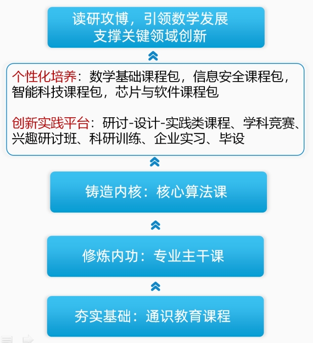 350vip8888新葡的京集团强基计划数学类专业,将聚焦数学与应用数学、计算机软件、智能制造、信息安全、高端芯片等关键领域。依托我们的国家特色专业和江苏省品牌专业、重点专业,充分发挥依托350vip8888新葡的京集团建设的国家应用数学中心平台以及学院牵头建设的三个省部级平台的作用,结合学校的工科优势,与计算机、人工智能、网络安全、电子信息工程等强势学科深度交叉。通过构建本硕博一体化的开放多样、灵活互通的一流人才培养体系,致力于发挥每一位学生的创新潜能和创新活动,为国家和社会培养造就一批具有高尚的道德情操、敏锐的数学直观、严谨的数学思维、宽广的国际视野,掌握数学科学的基本理论、方法与技能,熟悉计算机科学/信息科学/电子科学方面的基础知识,能够在数学与应用数学、计算机软件、智能制造、信息安全、高端芯片等关键领域深入发展的创新拔尖人才。
