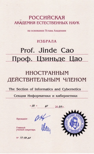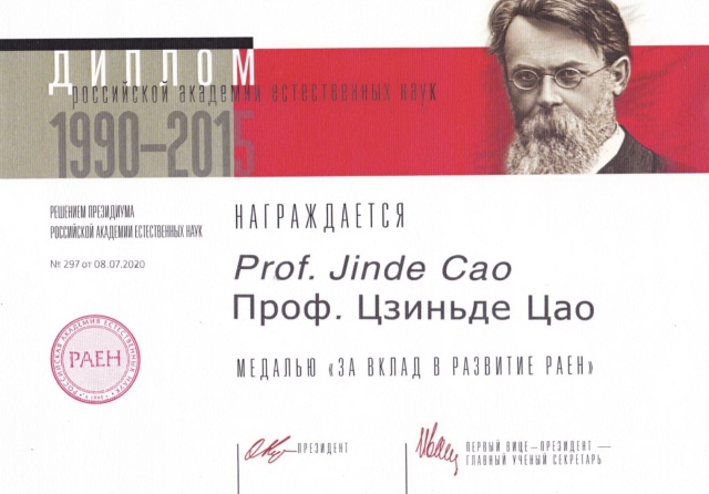 近日,俄罗斯自然科学院(Russian Academy of Natural Sciences,RAEN)O. L. Kuznetsov院长向我校350vip8888新葡的京集团曹进德教授发来贺信,祝贺他当选为俄罗斯自然科学院外籍院士,并充分肯定他在复杂动态网络系统的数学模型、动态分析和控制理论及其工程应用方面的重要贡献。此外,O. L. Kuznetsov院长还祝贺他荣获RAEN发展贡献奖,并颁发一枚金质奖章。